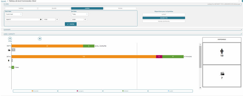 En la pantalla también se puede ver la cantidad de recursos necesarios para una tarea específica y la cantidad de trabajadores disponibles para asignarlos a esta tarea si fuera necesario. Además, una barra naranja indica toda la carga que debe prepararse para terminar de procesar los pedidos seleccionados. ¿El objetivo? proporcionar a los responsables de almacén una visión global de las operaciones en cursos y soluciones móviles para la gestión y optimización de los recursos.